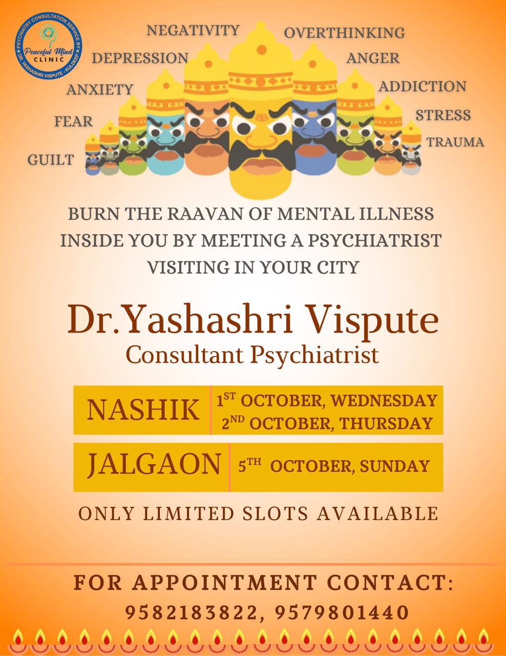Get the mental support you need with Dr. Yashashri Vispute, a seasoned psychiatrist with expertise in treating a wide range of mental health issues. With years of experience at reputed hospitals like Dr.Vaishampayan Memorial Government Medical College & Shri C.S.M General Hospital, Solapur; Bhabha Atomic Research Centre Hospital, Mumbai; Nair Hospital, Mumbai; Central Jail Hospital,Tihar,New Delhi; St Stephen’s hospital,New Delhi and more, she offers effective solutions for anxiety, depression, sleep problems, schizophrenia, bipolar disorder, OCD, hysteria, chronic pain, and more. From sexual problems and stress-related issues to marriage counseling and COVID-related mental health, Dr. Vispute has got you covered.